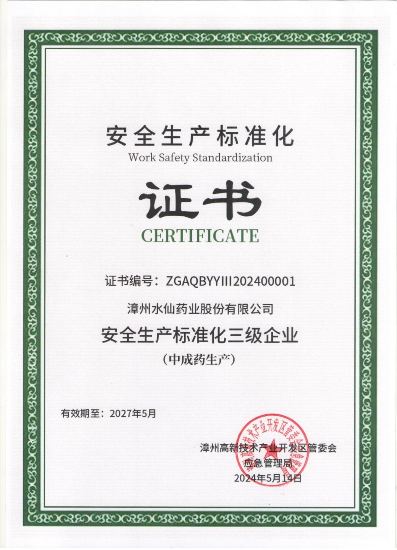 漳州sunbet申搏成功取得“安全生产标准化三级企业证书”